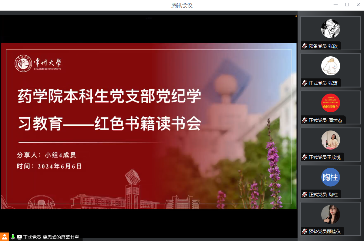 为进一步推动支部党纪学习教育活动走深走实,使全体党员从党史中汲取精神力量,从革命先辈事迹中感受共产党员党性修养。6月6日,本科生党支部党纪活动教育4小组组织开展了党纪学习教育暨“讲红色故事 扬红色精神”红色书籍读书分享会。