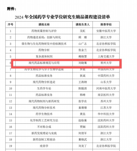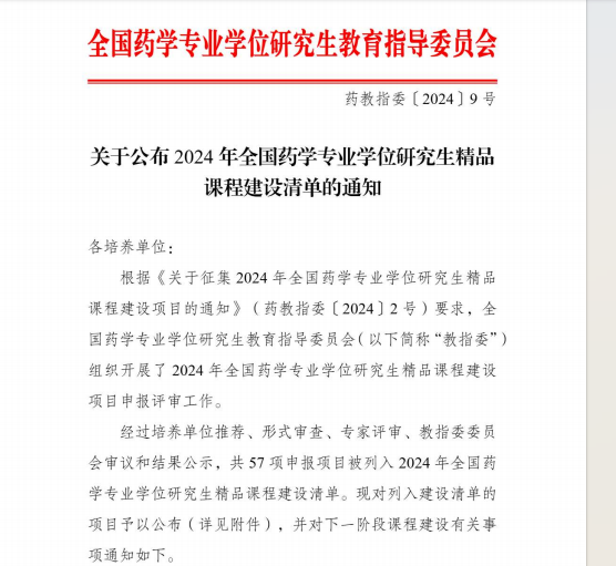 为进一步深化研究生课程教学改革,提升课程教学质量,加强研究生教学资源建设,js33333金沙线路检测根据“关于征集2024年全国药学专业学位研究生精品课程建设项目的通知”(药教指委[2024]2号),积极组织申报了药学专业学位的研究生相关课程。经评审,js33333金沙线路检测刘晓骞老师作为课程负责人的课程“现代药品标准规范与应用”成功入选2024年全国药学专业学位研究生精品课程建设清单。